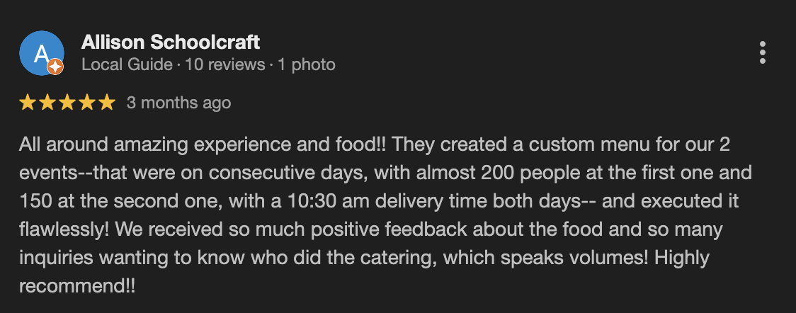 “They created a custom menu for our two events on consecutive days… and executed it flawlessly. We received so much positive feedback—and so many inquiries wanting to know who did the catering. Highly recommend!”