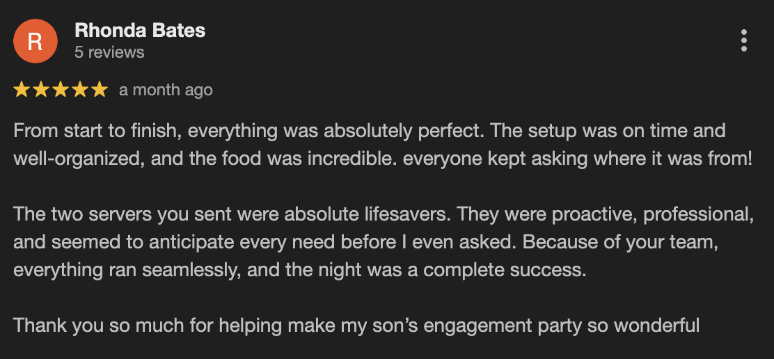 “From start to finish, everything was absolutely perfect. The setup was on time and well-organized, and the food was incredible. Everyone kept asking where it was from! The two servers you sent were absolute lifesavers… everything ran seamlessly, and the night was a complete success.”