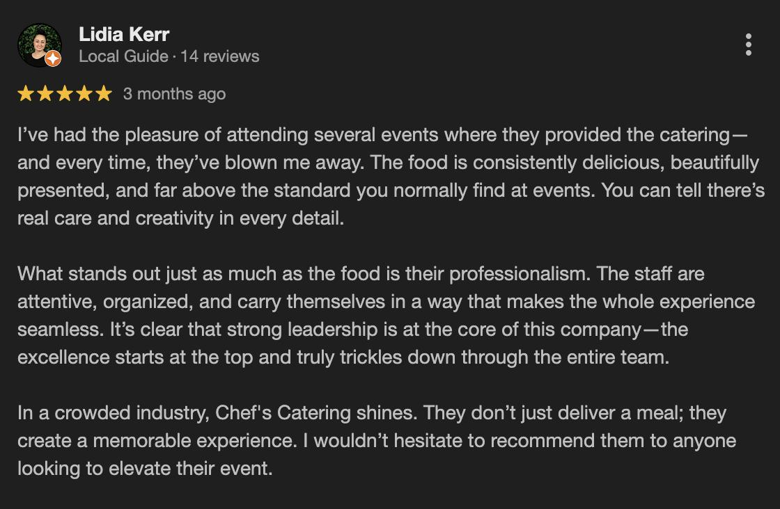 Lidia has attended several events where Chef’s Catering was chosen—and her feedback highlights something we take pride in: consistency and presentation.