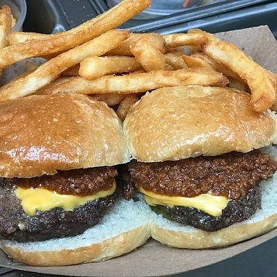 hand pressed burgers, topped with American cheese, pickles, meat hot sauce on our house baked slider rolls